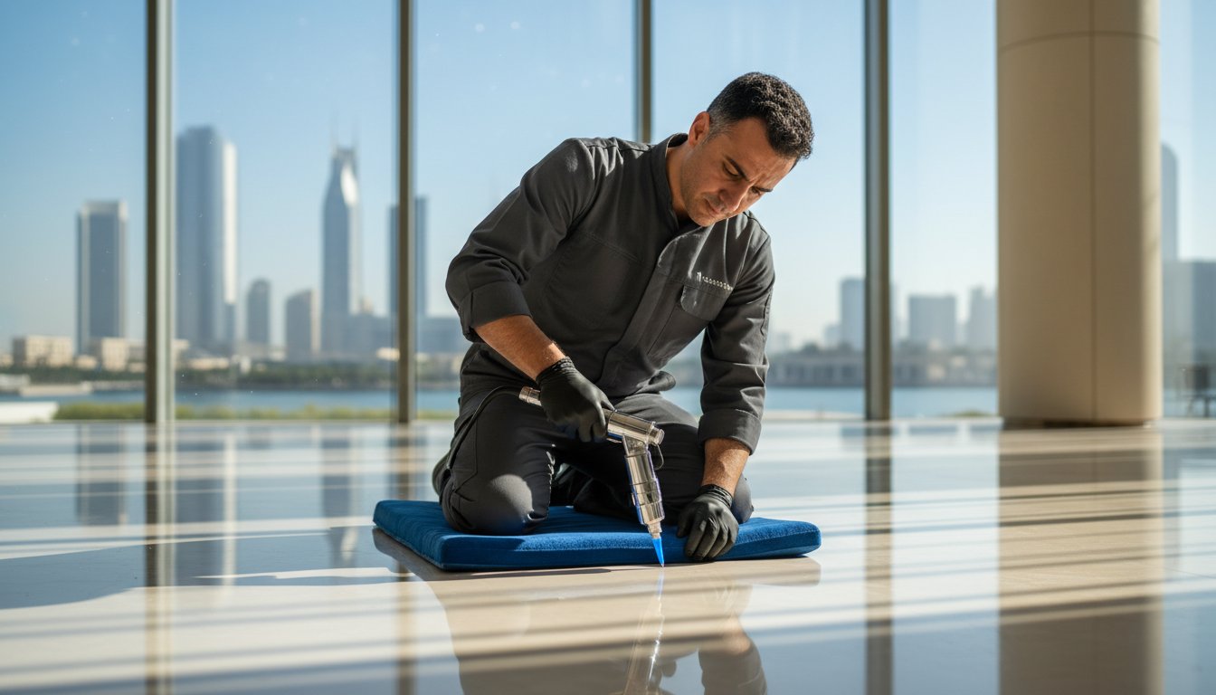 The first 60 minutes after a surface is damaged are critical for containment and cost control. When a granite floor chips in a high-traffic lobby or a glass partition cracks in a commercial office, the priority is to secure the perimeter. Cordon off the area immediately to prevent foot traffic from grinding debris into the substrate. This prevents further degradation of the material edges, which can turn a simple AED 500 repair into a complex restoration costing over AED 1,500. Avoid cleaning the area with harsh chemicals; a dry, lint-free cloth is sufficient to remove loose particles without reacting with the base material.